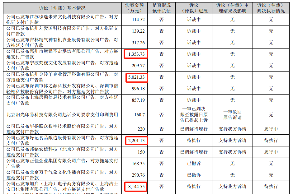 分众财报里有个“其他诉讼事项”列表,有很多客户在分众为其发布广告后不支付广告费,被分众起诉,涉及的广告费金额有的高达好几千万。