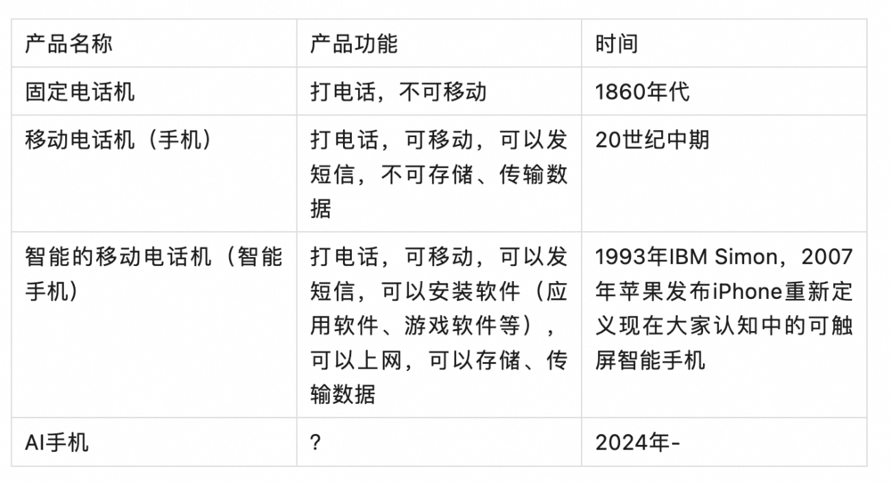 我首先会思考手机这个产品的价值,手机其实以前更通用的叫法是“移动电话”,我列了一个表格归纳手机的演进历史: