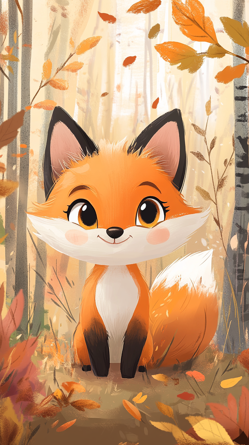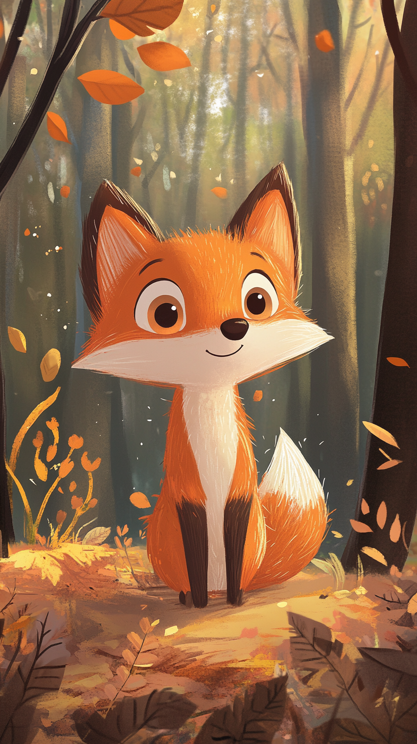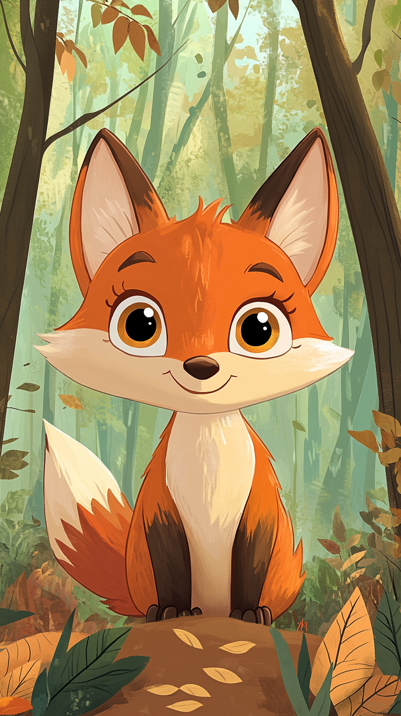 Prompt:A cute cartoon fox in the forest, in the style of children's book illustration, with simple colors, a full-body portrait, warm colors, a happy expression, cute big eyes,