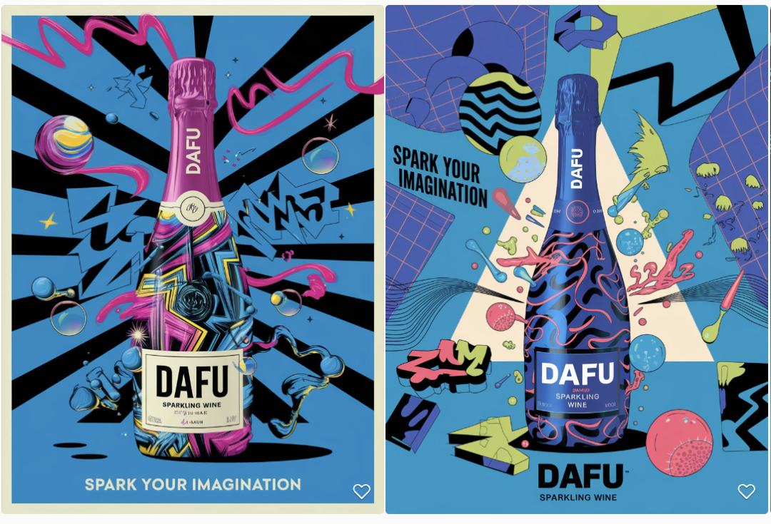 DAFU起泡酒创意海报,旨在激发想象力。使用电蓝和霓虹粉等大胆对比的色彩,营造出现代、时尚的视觉冲击。背景采用抽象几何图形,并配以动态线条或波浪,象征无限的创意和可能性。DAFU酒瓶由创意元素构成或环绕,如抽象艺术作品、变形为涂鸦风格的气泡、音乐符号或抽象剪影。口号“点燃你的想象力”被醒目地呈现,强调DAFU不仅仅是一款起泡酒,更是创意灵感的源泉。