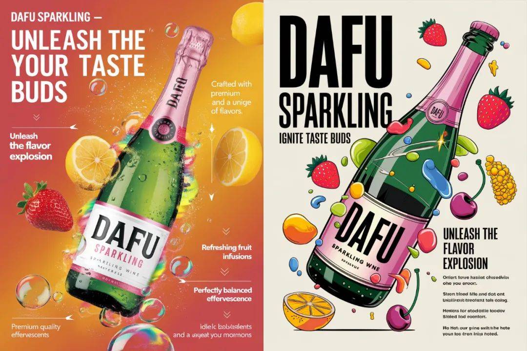 A vibrant product poster for DAFU sparkling wine. Display the DAFU bottle dynamically, surrounded by colorful bubbles and fruity elements.Highlight selling point, Include text: 'DAFU Sparkling – Ignite Your Taste Buds,' 'Unleash the Flavor Explosion,' with selling points like 'Crafted with premium ingredients and a unique blend of flavors,' and features such as 'Premium Quality Ingredients,' 'Refreshing Fruit Infusions,' 'Perfectly Balanced Effervescence,' and 'Ideal for Celebrations and Everyday Moments '