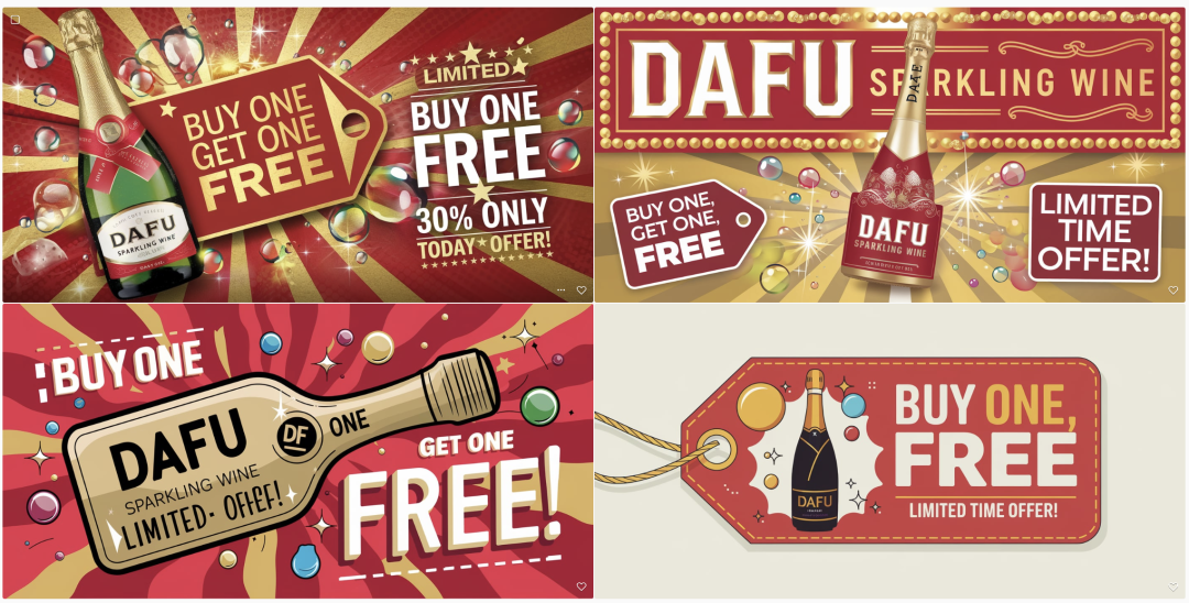 这组随机生成的banner,充分展现了模型对“限时优惠”的语义理解能力,有效突出机制利益点&行动点,以提升点击率及ROI转化。