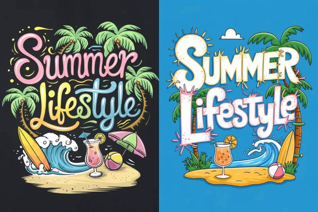 A vibrant and playful illustration of 'Summer Lifestyle' set against a dark backdrop. The whimsical, multi-colored text, featuring splashes of pink, yellow, and green, captures the essence of the season. Surrounding the words is a tropical paradise with gently swaying palm trees, a surfboard riding a wave, and a beach umbrella offering shade. A refreshing cocktail with a slice of lemon sits on the sand, complemented by a beach ball and sunny skies.
