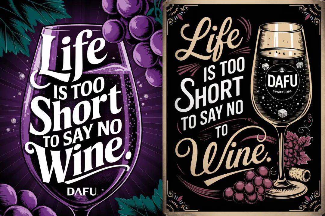 一张充满活力且优雅的海报,醒目地呈现了“生命太短暂,不要对美酒说不”这句名言,字体为粗体手写体。背景上绘有“DAFU”品牌起泡酒杯的插图