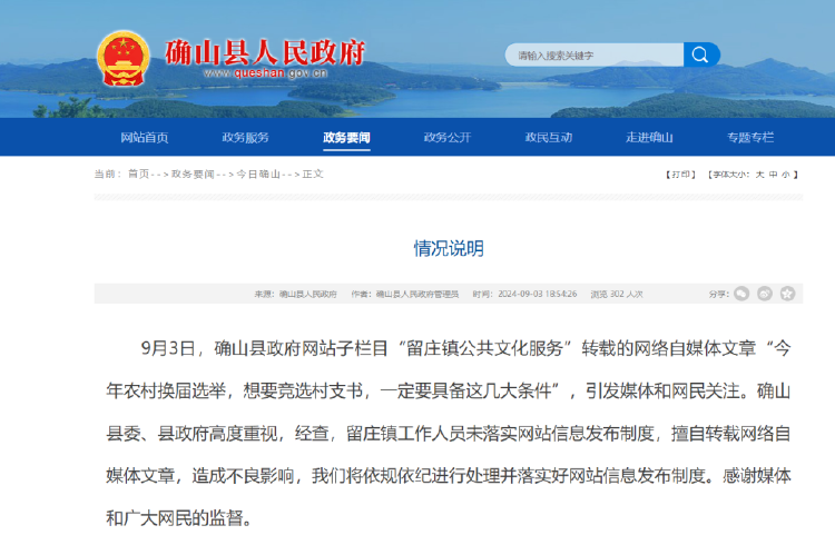 据上游新闻,9月3日晚,确山县人民政府网站发布情况说明称,9月3日,确山县政府网站子栏目“留庄镇公共文化服务”转载的网络自媒体文章“今年农村换届选举,想要竞选村支书,一定要具备这几大条件”,引发媒体和网民关注。