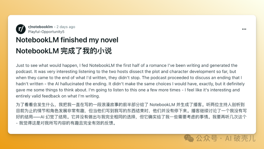 使用 NotebookLM 的 AI 播客功能,听一听两个 AI 凑在一块讨论小说情节,甚至他们还会热烈讨论剧情接下来如何发展... 这不正是创意的素材么?