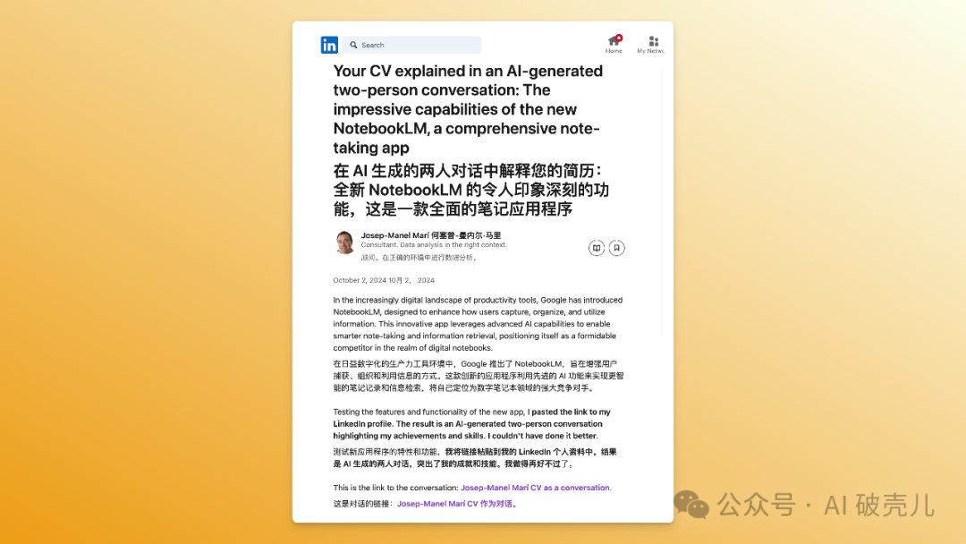 ⬇️ 我们一起来听一下,NotebookLM 是如何来介绍他的。