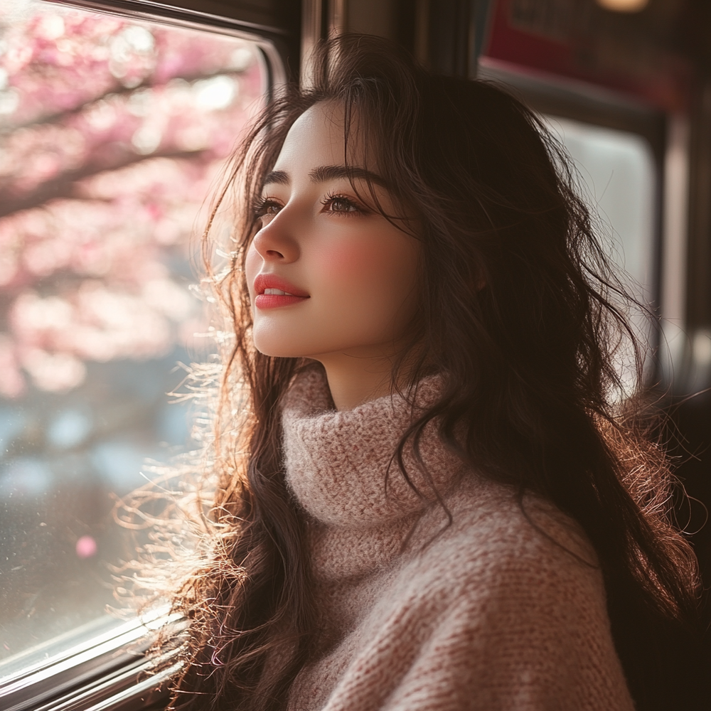 一位女性坐在列车车窗旁,阳光透过窗户洒在她的脸上,映照出柔和的光影效果。她穿着浅粉色的毛衣,表情宁静,眼神中带着憧憬,窗外的樱花树隐约可见,渲染出浪漫且宁静的氛围。