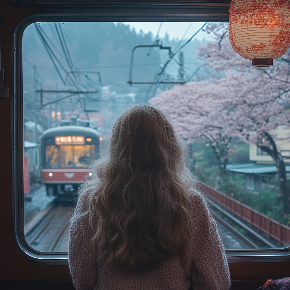 一位金发女性靠在列车窗边,背景中樱花树与铁道交相辉映,营造出一种梦幻的旅途感。她身穿粉色毛衣,背后是淡淡的春日气息,蓝调的色调为画面增添了一种清新与冷静的美感。