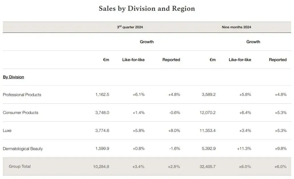 整个欧莱雅集团的业务被划分为了专业美发产品、大众化妆品、高端化妆品、皮肤科学美容四大部门。高端化妆品一直是毛利率最高的业务,今年前九个月的却只同比增长了3.4%,增速在四大板块中继续垫底。