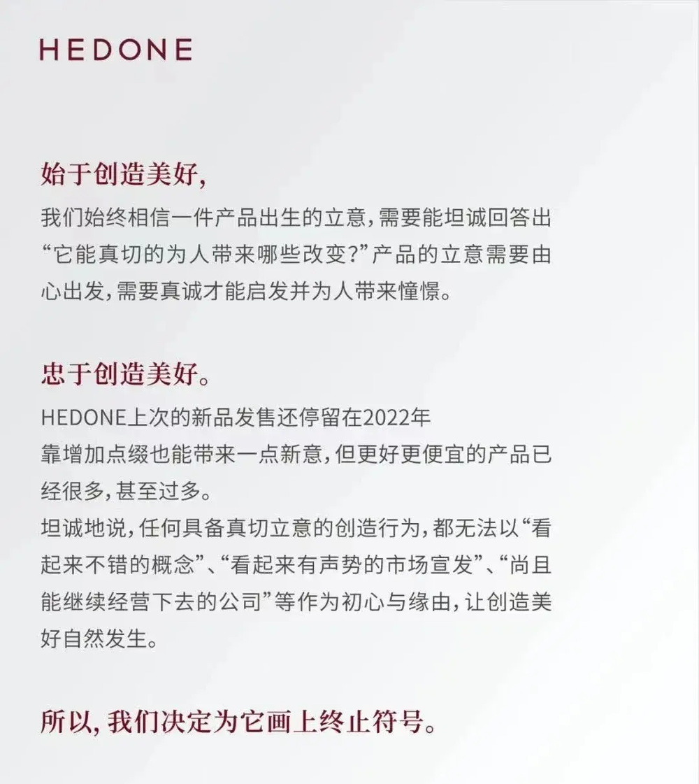 10月初,国货彩妆品牌HEDONE宣布将在11月9日正式结业。它曾在2017-2019年相继获得过来自澎湃资本、红杉中国种子基金和辰海资本的三轮融资,却不得不因为“市面上更好更便宜的产品已经很多甚至过多”,“无法以‘看起来不错的概念’、‘看起来有声势的市场宣发’作为初心”,给自己按下了终止键。