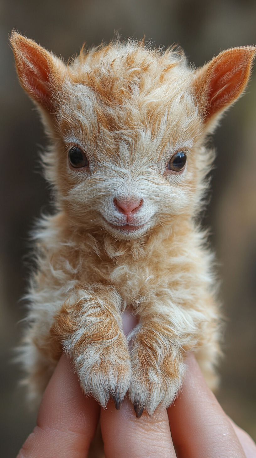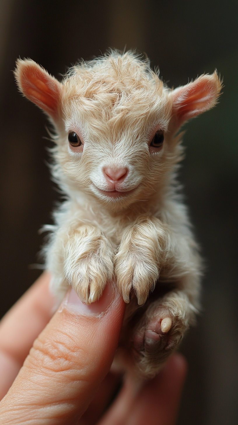 Prompt: Create a hyper-realistic image of an incredibly tiny, baby goat small enough to rest comfortably on the tip of a human finger. The goat should have soft, detailed fur, expressive eyes, and a delicate posture, emphasizing its miniature scale.