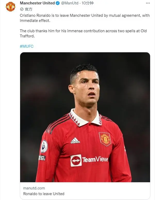 【曼联官方:C罗离队,即刻生效】据央视网,北京时间11月23日,曼联官方消息,C罗在双方协商一致的情况下离队,立即生效。曼联公告称,克里斯蒂亚诺-罗纳尔多将在双方同意的情况下离开曼联,立即生效。俱乐部感谢他在老特拉福德的两个赛季做出的巨大贡献,他在346场比赛中攻入145个进球,并祝愿他和他的家人未来一切顺利。 曼联的每个人都专注于在滕哈赫的带领下继续球队的进步,并共同努力在球场上取得成功。