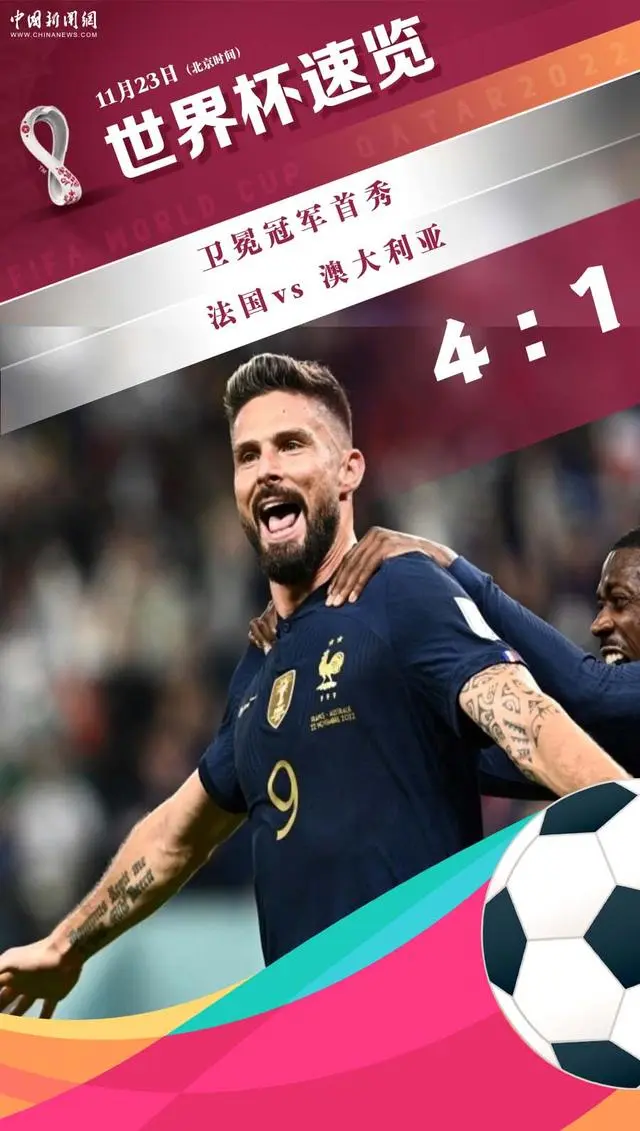 【法国4:1战胜澳大利亚】据中新网,北京时间23日凌晨,2022年卡塔尔世界杯D组小组赛继续进行。卫冕冠军法国队在先失一球的情况下连扳四球,以4:1战胜澳大利亚队,收获开门红。此役,法国队中锋吉鲁梅开二度,就此追平亨利并列法国队史射手王。