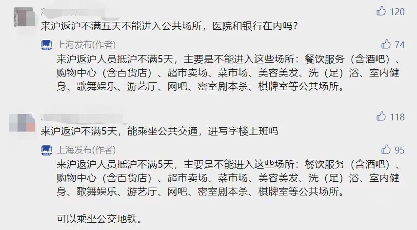 对此上海发布回应称,“来沪返沪人员抵沪不满5天,主要是不能进入这些场所:餐饮服务(含酒吧)、购物中心(含百货店)、超市卖场、菜市场、美容美发、洗(足)浴、室内健身、歌舞娱乐、游艺厅、网吧、密室剧本杀、棋牌室等公共场所。可以乘坐公交、地铁。可以进公司,只是不能进文中列举的公共场所,尽量减少疫情扩散风险。”