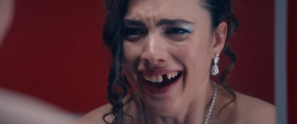 她的牙齿一颗接一颗掉落,整张嘴变成了血窟窿,她试图戴上耳环,结果整只耳朵掉落下来。面对围上来的油腻的男性高管们,她悲哀地露出了一个大大的抿嘴微笑:因为哈维说,漂亮女孩就是要笑口常开。