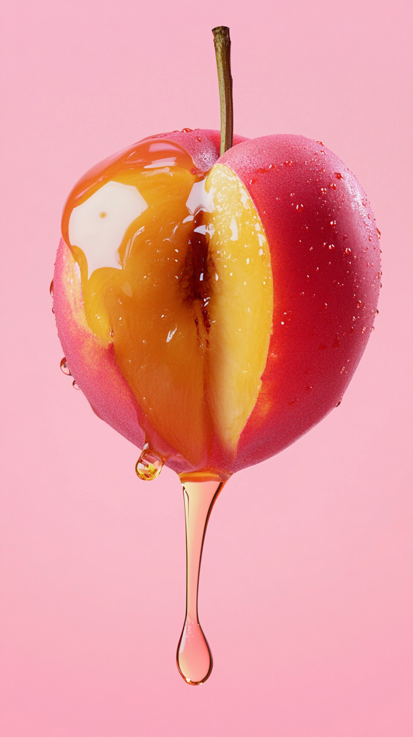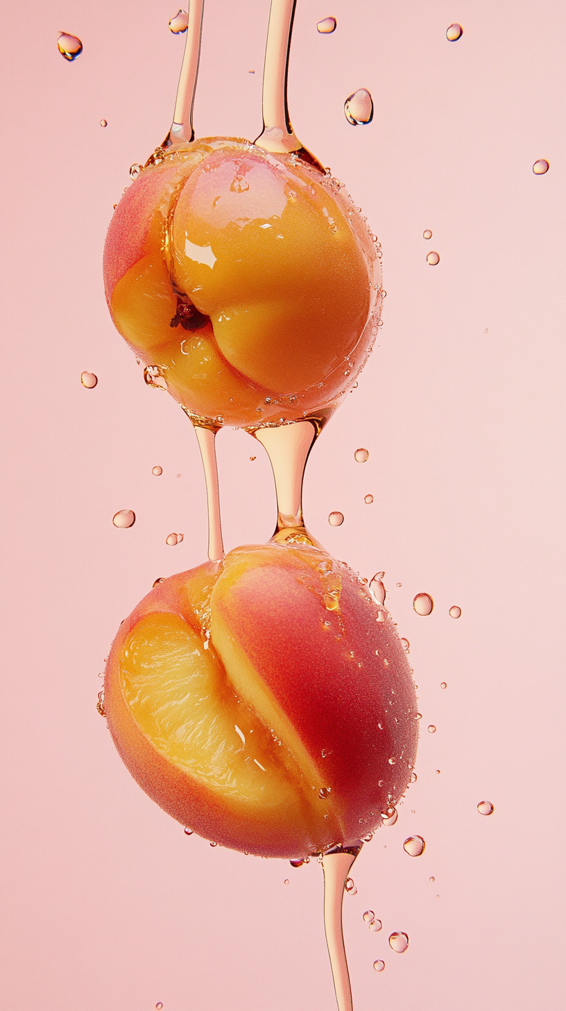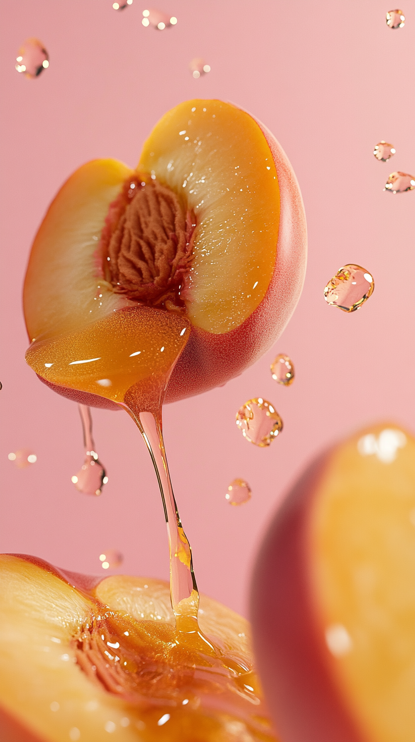 Prompt: Peach and honey dripping, minimalist aesthetic, pink background, hyperrealistic photography.