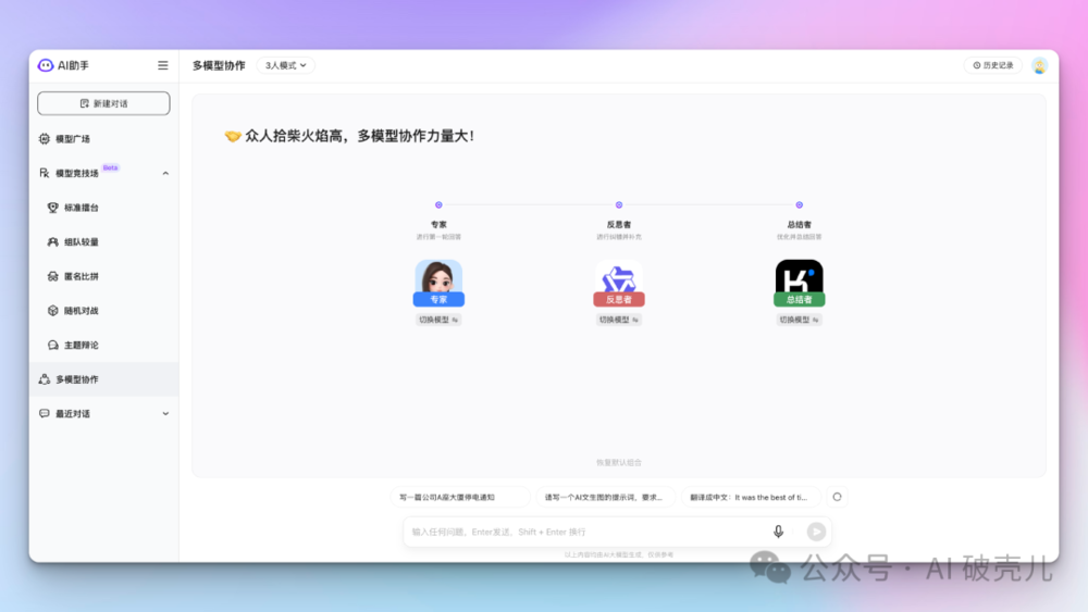 非常推荐使用「多模型协作」这个功能。这是一种类似「众包」的模式,集成多个 AI 模型,用户可以选择不同的 AI 分别担任“专家”“反思者”“总结者”三个角色。