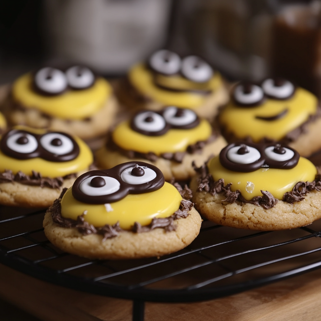 一组摆放在黑色冷却架上的创意饼干。每个饼干都被装饰成小黄人的表情,包括黄色的糖霜底色,巧克力制作的眼睛框架,白色的眼球,以及饼干边缘点缀着巧克力碎屑。饼干整齐地排列着,每个都带着可爱的表情,做工精致统一。