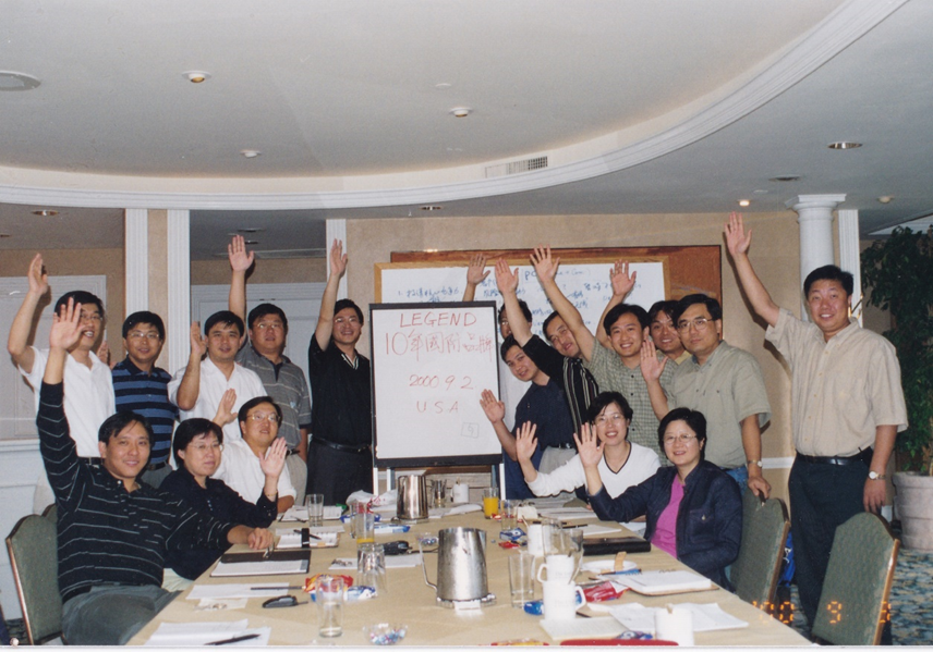 2000年9月,联想管理团队赴美国考察,提出了“联想在十年内进入世界知名品牌行列”的目标。在总计10天的考察即将结束时,在美国加州圆石滩的一家酒店里,杨元庆(后排左五)在白板上写下“LEGEND 10年国际品牌”。