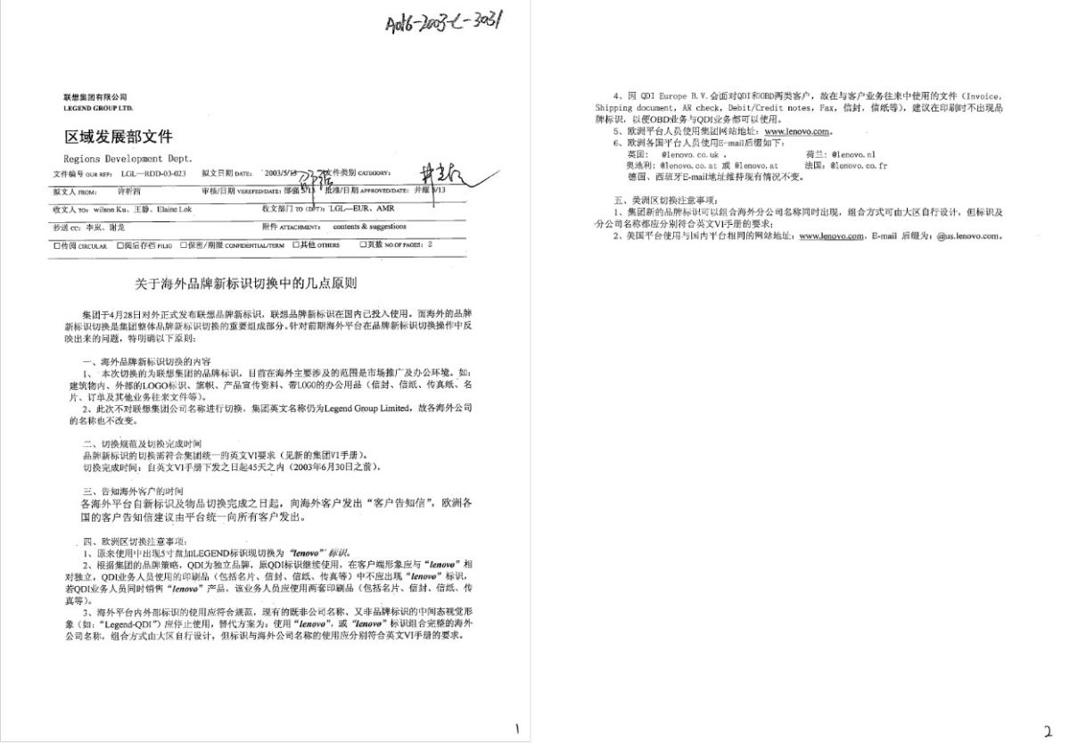 2003年4月,联想集团正式对外宣布启用新标志“lenovo联想”,以“lenovo”代替原有的英文标志“Legend”。2004年,联想集团全球品牌标志正式从“Legend”更名为“Lenovo”,并在全球范围内注册。