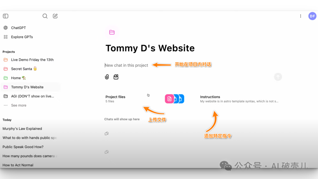 用户可以为每个项目上传相关文件(例如文档、表格)并设定特定的指令,使 ChatGPT 的回复更贴合项目主题。