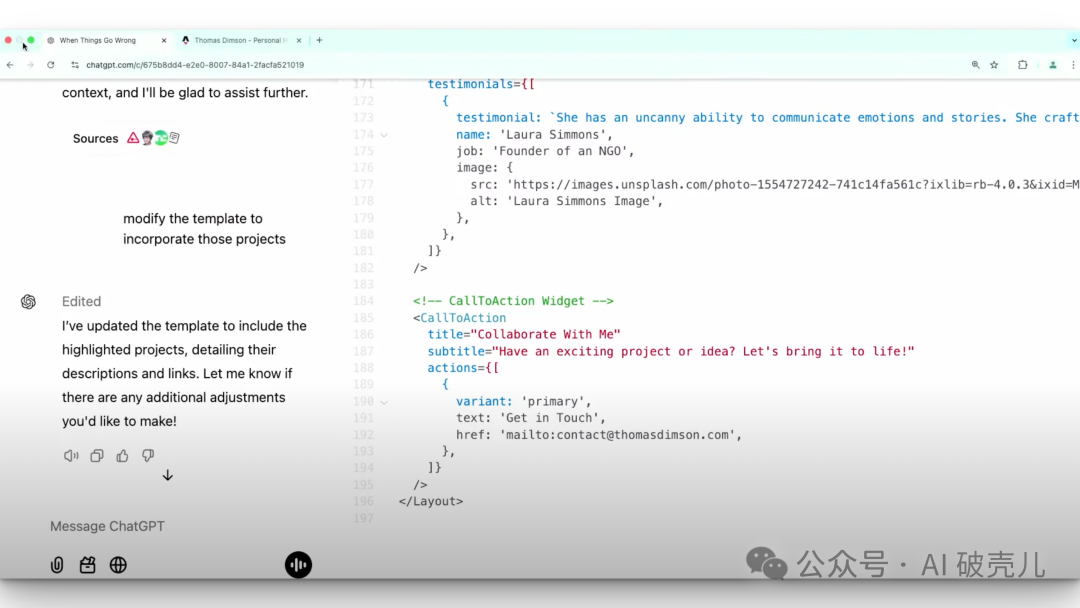 然后,他在项目中使用画布功能,要求 ChatGPT 根据需求修改网站代码;紧接着又要求 ChatGPT 检索更多内容并添加到模板;最后,用户对网站的部分内容提出了修订需求,于是 ChatGPT 继续在画布中迭代代码。用户只需要不断将代码进行复制和网页预览即可。