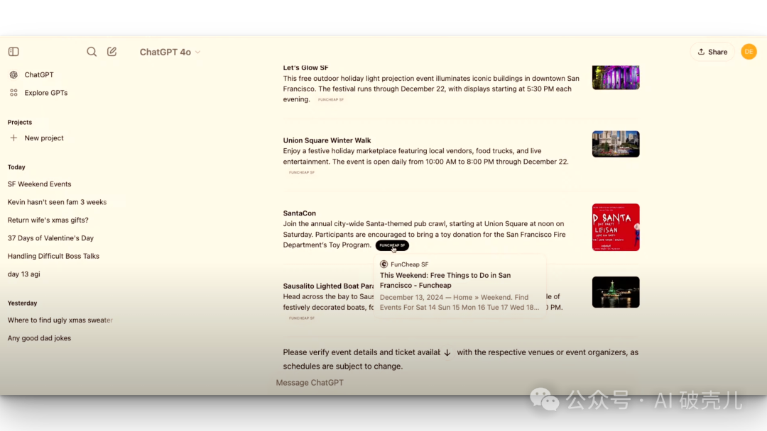 为了确保信息的准确性,他开启了搜索功能。这使得 ChatGPT 在回答问题时会搜索网络,并将找到的信息来源引用出来。