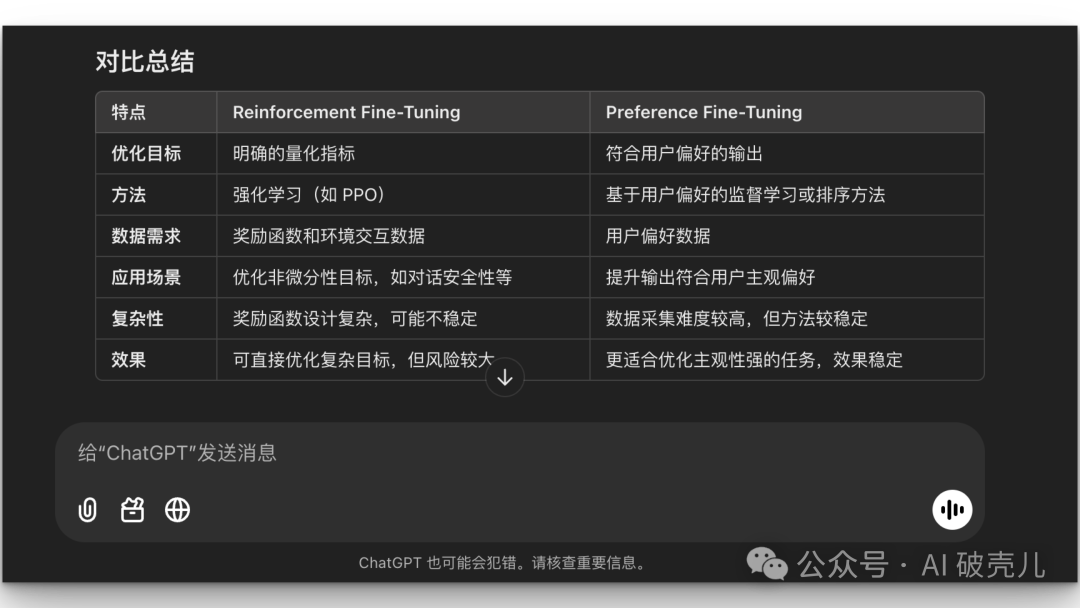需要注意的是,“强化微调”跟“偏好微调”在很多方面都截然不同。同时,前者适用于 o1 模型,后者适用于 GPT-4 模型。可以直接看一下 ChatGPT 的总结对比: