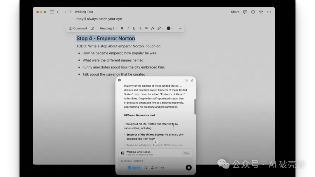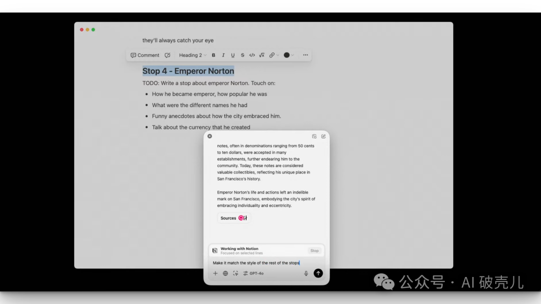 于是,他在 Notion 中选中了关于“诺顿皇帝”的部分内容,然后在聊天窗口中输入了简单的指令:“补充这些谈话要点”。