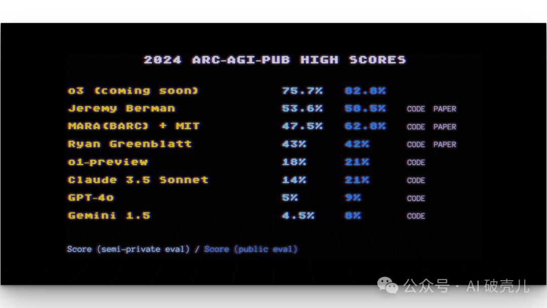 4. ARC-AGI 测试是一个旨在评估人工智能模型推理能力的基准测试。它不依赖于模型已有的知识储备,而是通过一系列需要全新学习和解决的难题来考察模型的快速学习和推理能力。在 ARC-AGI 测试中,o3 不仅超过 Claude 3.5 Sonnet 和 Gemini 1.5,甚至超过了人类的平均水平。