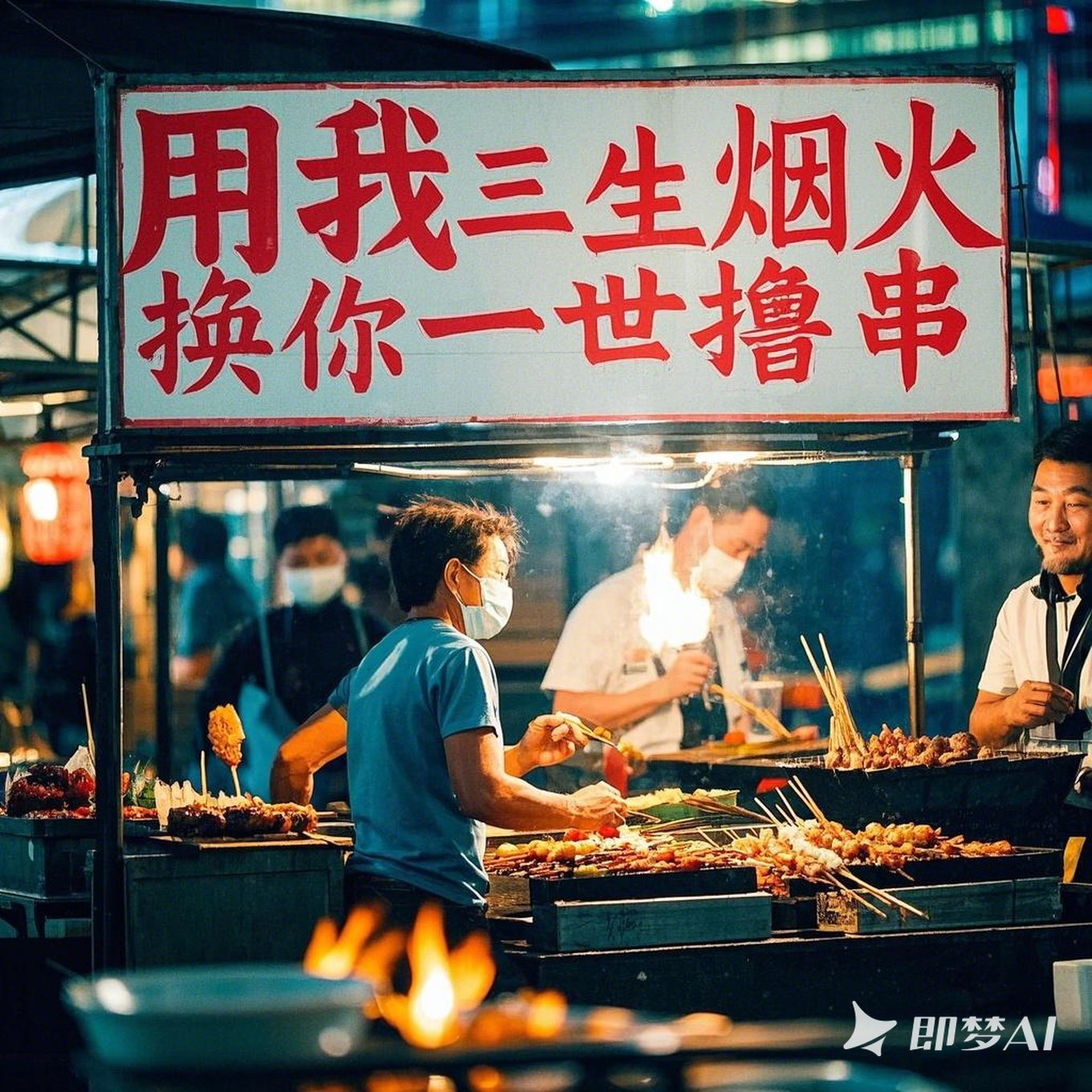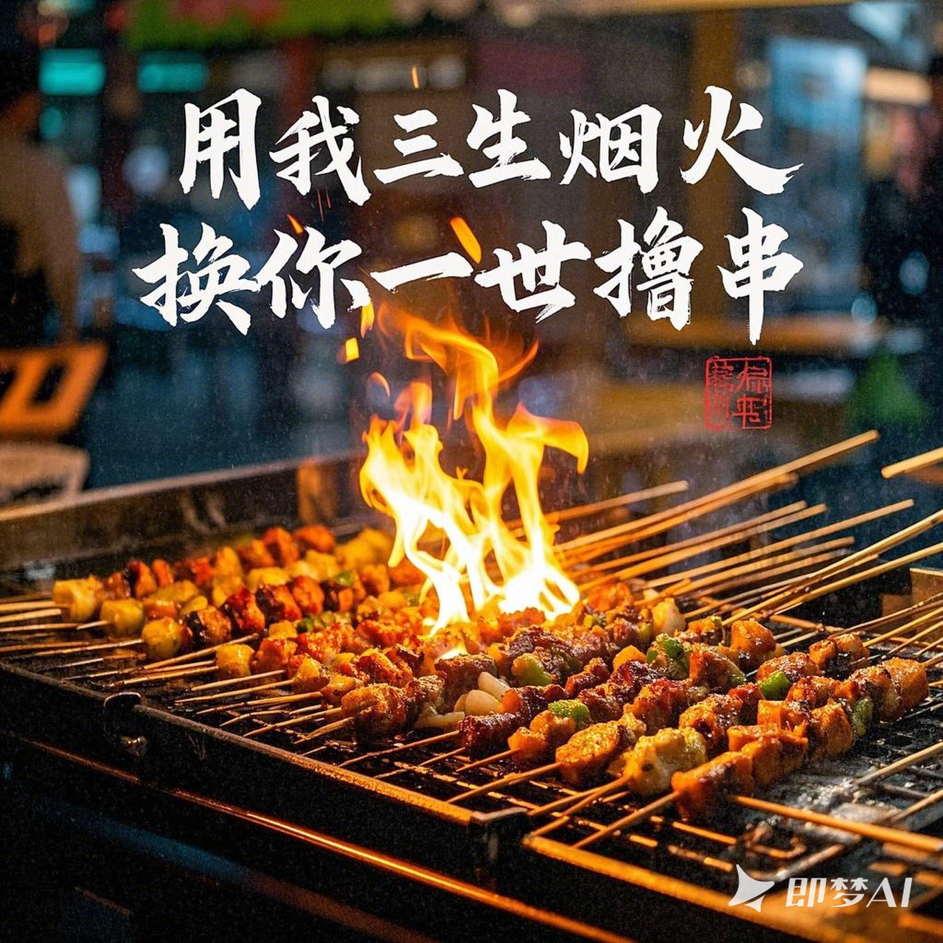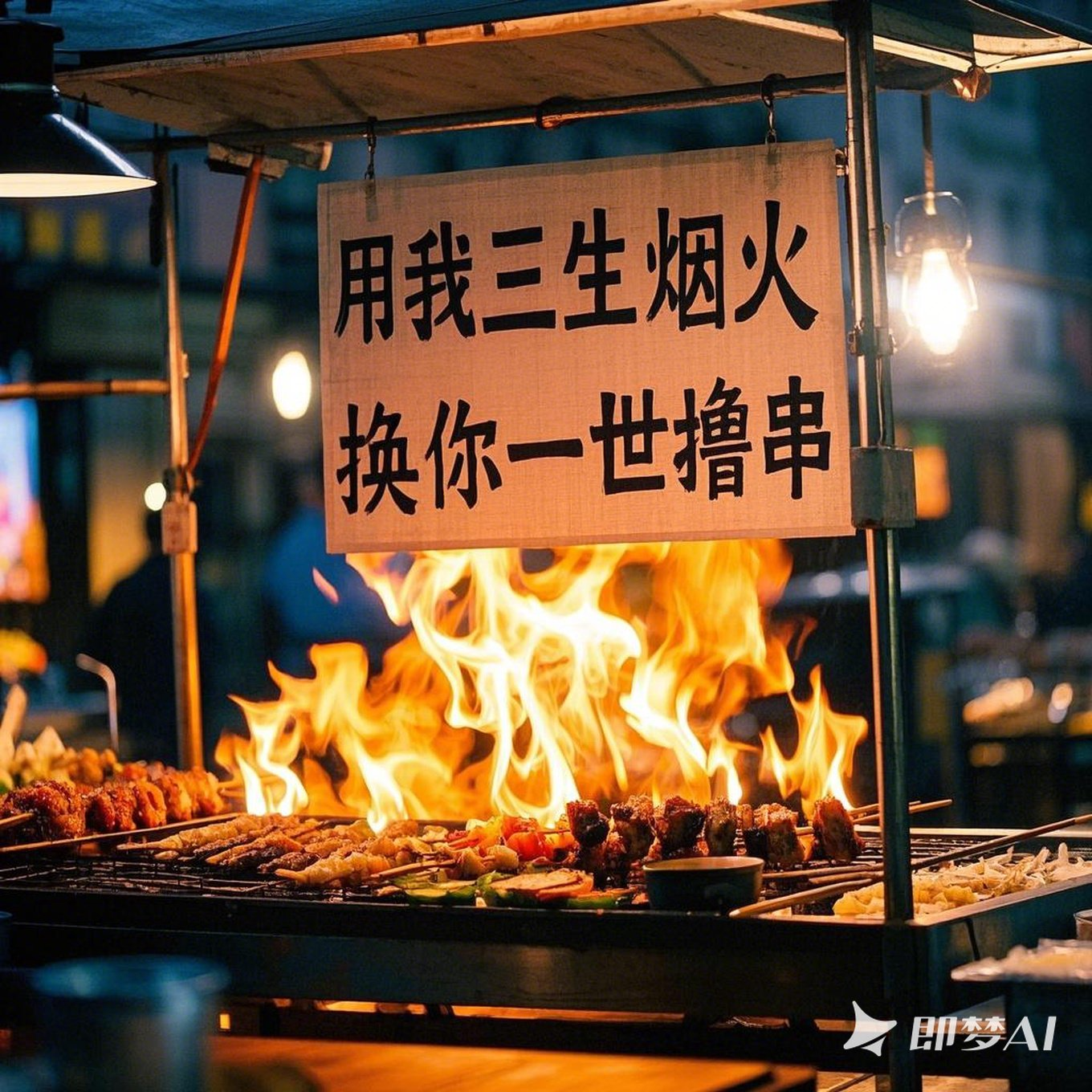 提示词: 一张夜市烧烤摊的画面,满屏烟火气息,标题是“用我三生烟火,换你一世撸串”,提示词: 一张夜市烧烤摊的画面,满屏烟火气息,标题是“用我三生烟火,换你一世撸串”,提示词: 一张夜市烧烤摊的画面,满屏烟火气息,标题是“用我三生烟火,换你一世撸串”,