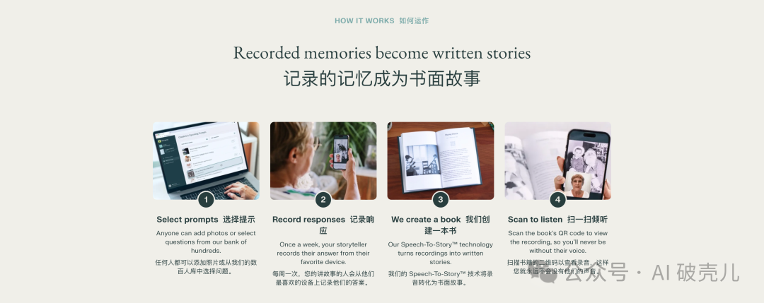 它的使用场景很别致:长辈通过接受 AI 的”采访“,用录音的方式将自己的人生故事记录下来,然后 AI 将这些口述内容整理成书。
