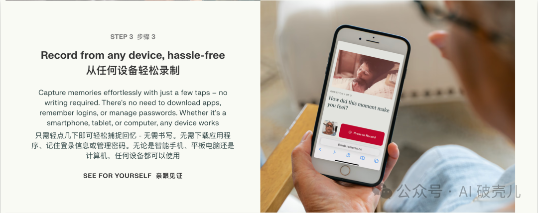 在录制 AI 回忆录时,Remento 设计了巧妙的方式,使得他们无需输入密码、无需下载、无需打字,只需要在收到采访提醒时点击录制,像语音留言一样,只需要说话就能进行记录。