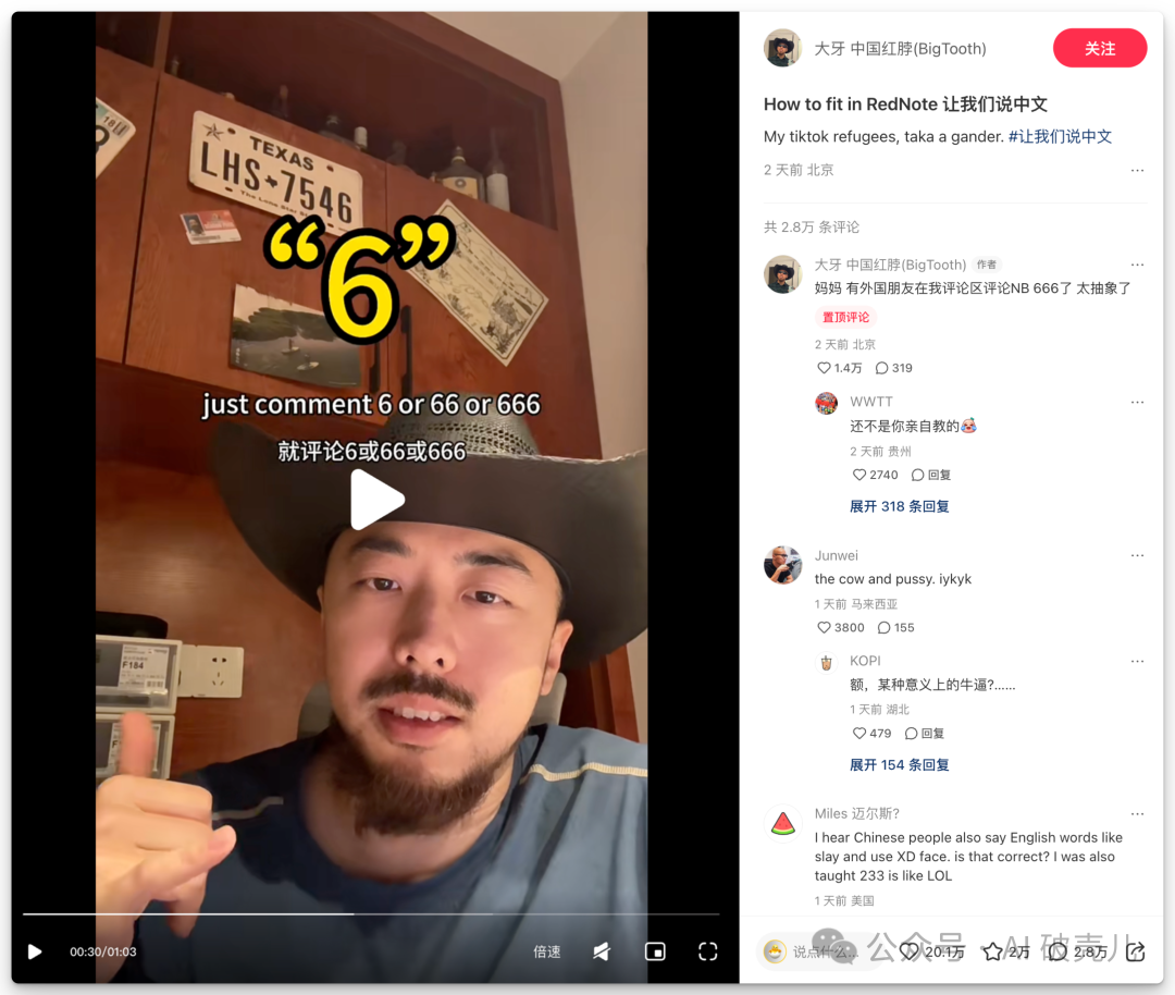 比如:国内博主 @大牙 中国红脖(Big Tooth) 向海外用户介绍中文社交平台常用表达,比如“666”“NB”“xswl”等热门短语,并提供这些表达背后的内涵和使用场景。仅这一条视频就获得了超过 20 万的赞。