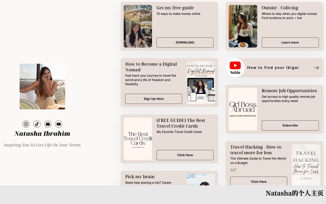 “很多人以为我只是在周游世界玩乐,其实这是一种新生存方式的选择。”她忽闪着迷人的大眼睛告诉我,“我就专注做自己喜欢的内容,不仅能获得平台收入、品牌广告收入,我还开设课程教别人经营社交账号。”更让我惊讶的是,她还建立了一个帮助女性找到远程工作机会的平台。