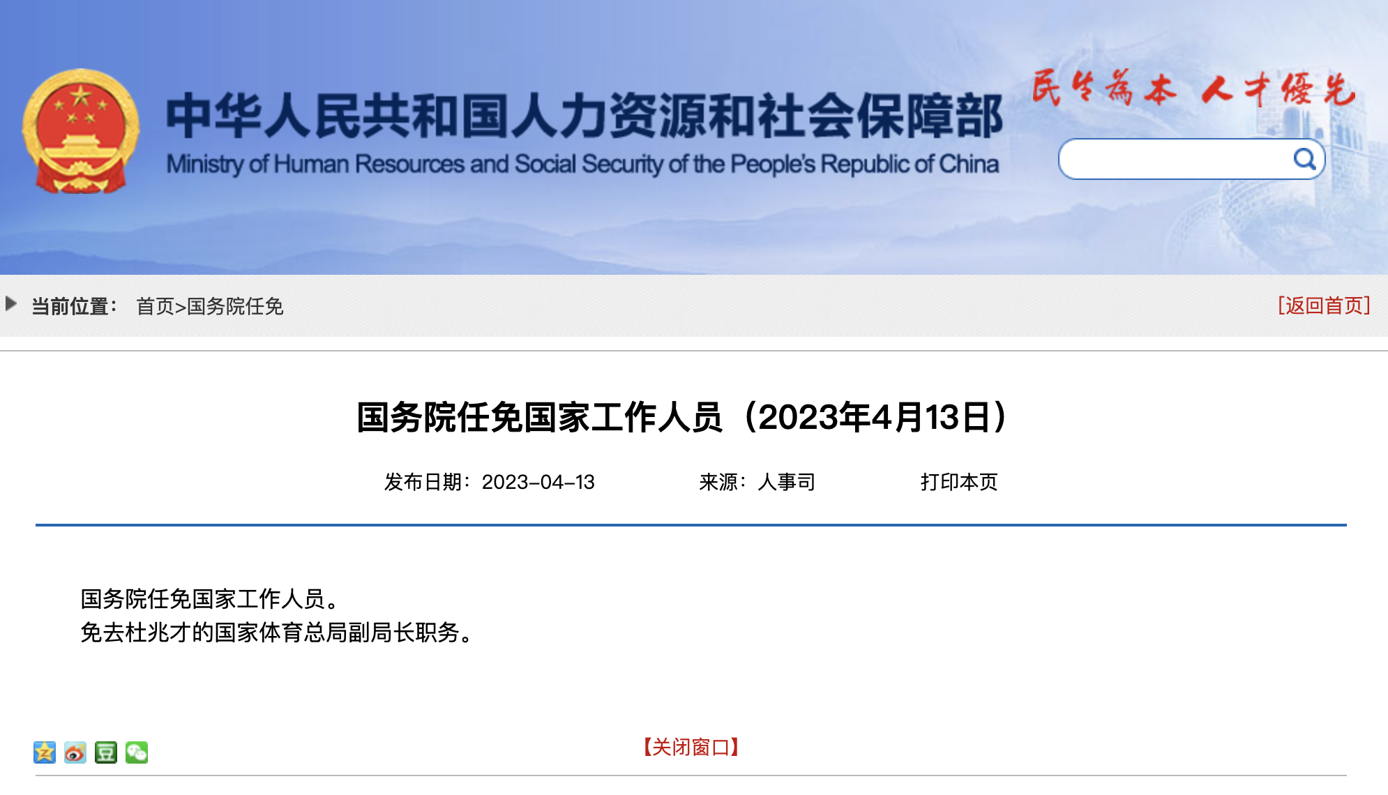 据人社部网站4月13日消息,国务院任免国家工作人员。