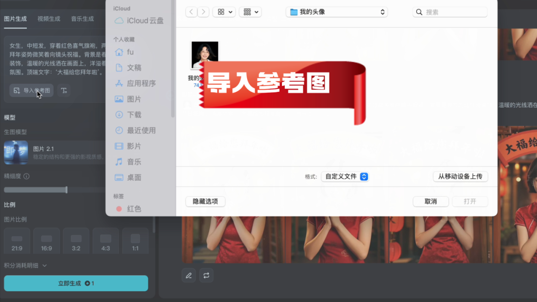 只要在写入的图片生成提示词增加一个小步骤,点击导入参考图,选择一张你的头像:
