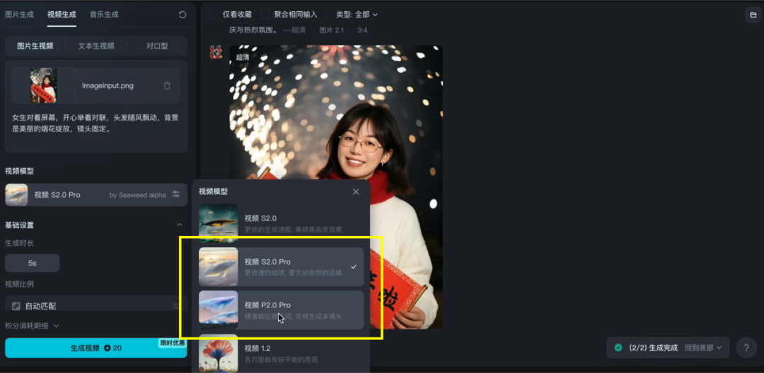 接点击心仪图片,选择生成视频,模型选择S2.0 pro 或P2.0 pro,输入提示词。