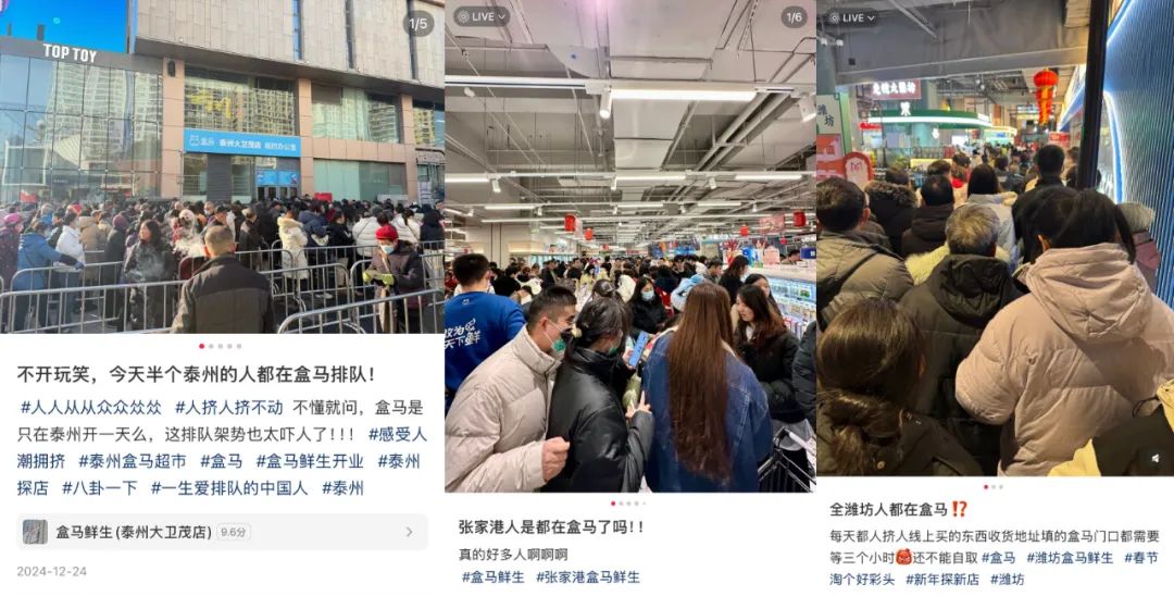 这里的“xx”可以换成很多个三线甚至更小的城市。有人说半个泰州的人都在盒马,不知道的人以为到了景区。有人说整个张家港的人都在盒马,评论区立刻有人响应称自己每天都去一趟,试吃了好多东西。还有潍坊朋友说,不止盒马人多,连盒马外面的马路都被围得水泄不通。