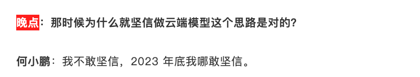 晚点记者问,刚开完的战略会,有什么共识,何小鹏说:“最大的共识就是形成了共识。”当时就给我逗笑了,如果这篇采访有视频版,那应该非常有意思。