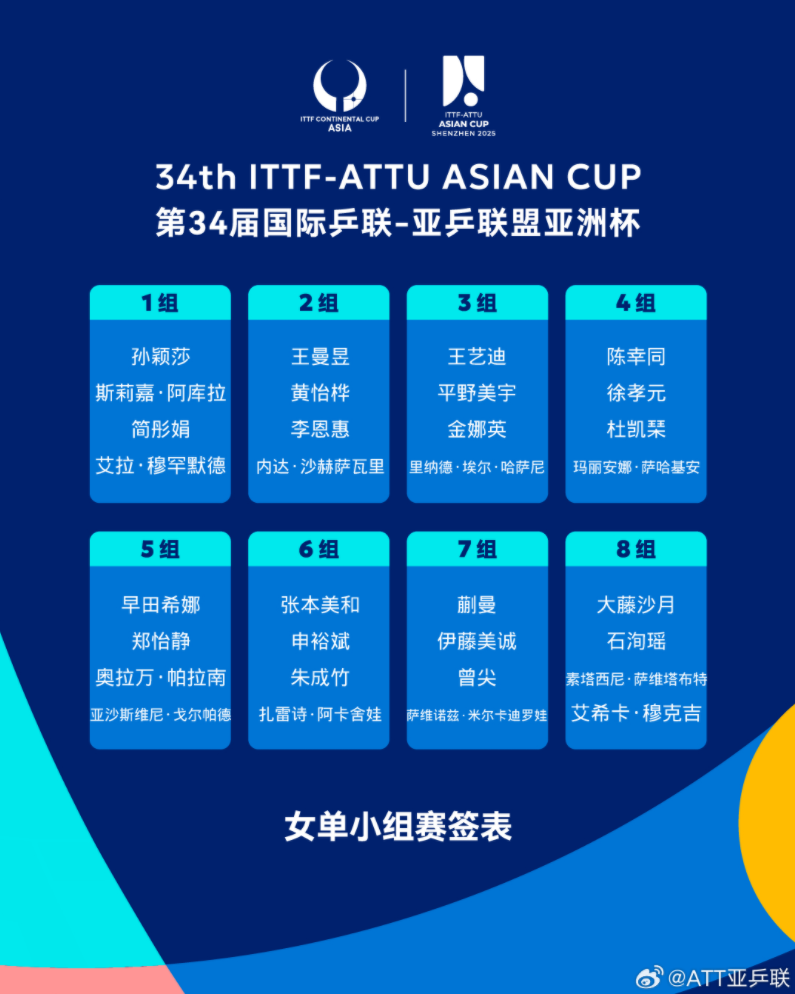 据界面新闻,第34届国际乒联-亚乒联盟亚洲杯将于2025年2月19日至23日在深圳大运中心体育馆举行。根据2月18日下午的抽签仪式结果,孙颖莎首轮与阿库拉同组,王曼昱、王艺迪等所在的女单小组赛签表如下。