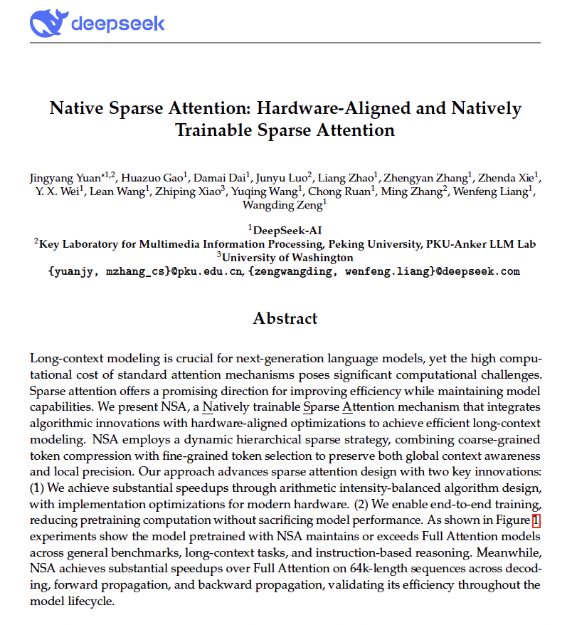 记者注意到,在这篇名为《原生稀疏注意力:硬件对齐且可原生训练的稀疏注意力机制》(Native Sparse Attention: Hardware-Aligned and Natively Trainable Sparse Attention)的论文署名中,DeepSeek创始人梁文锋也作为共创在列。