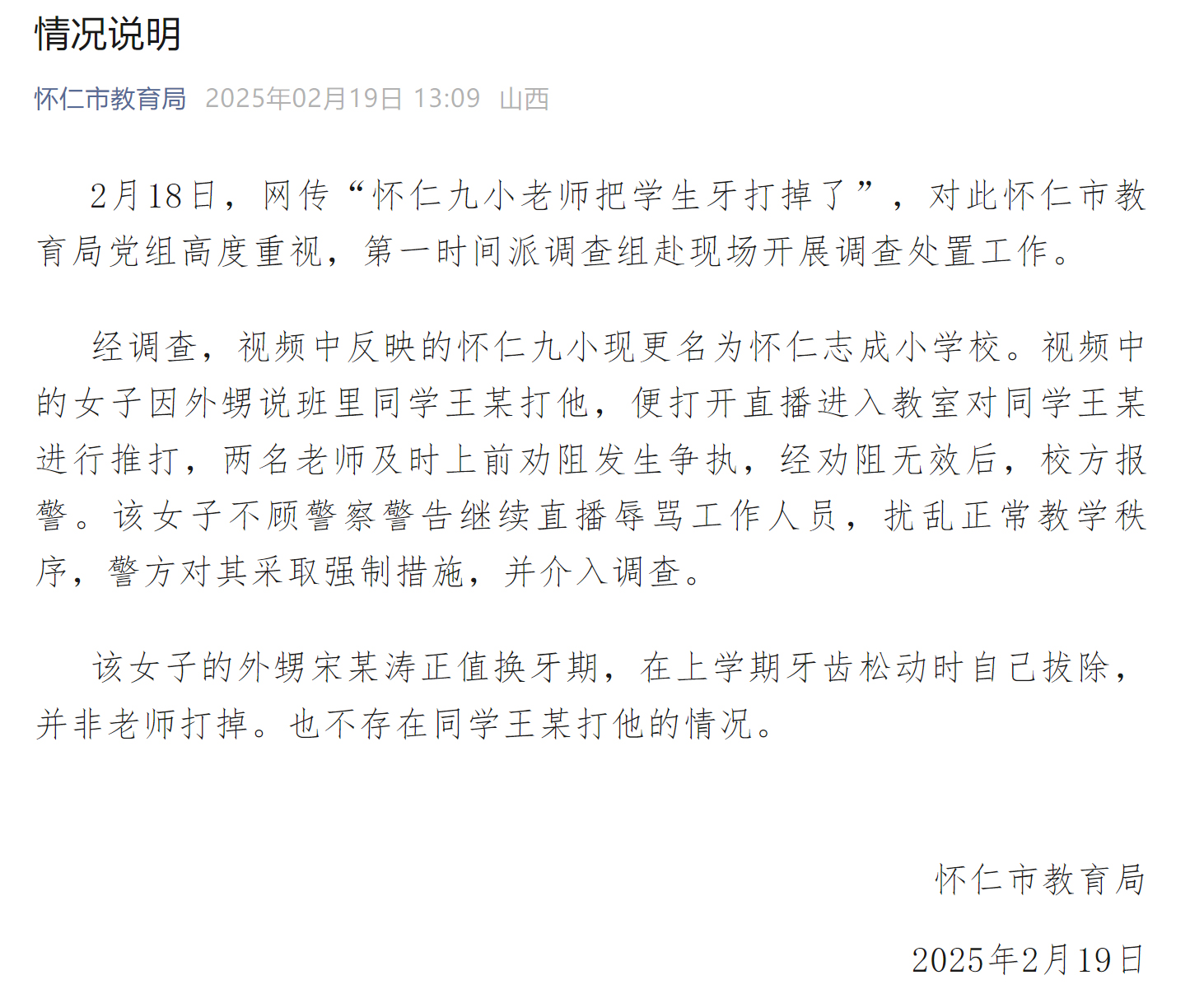 据央视网,据怀仁市教育局微信公众号消息,2月19日,怀仁市教育局发布情况说明。