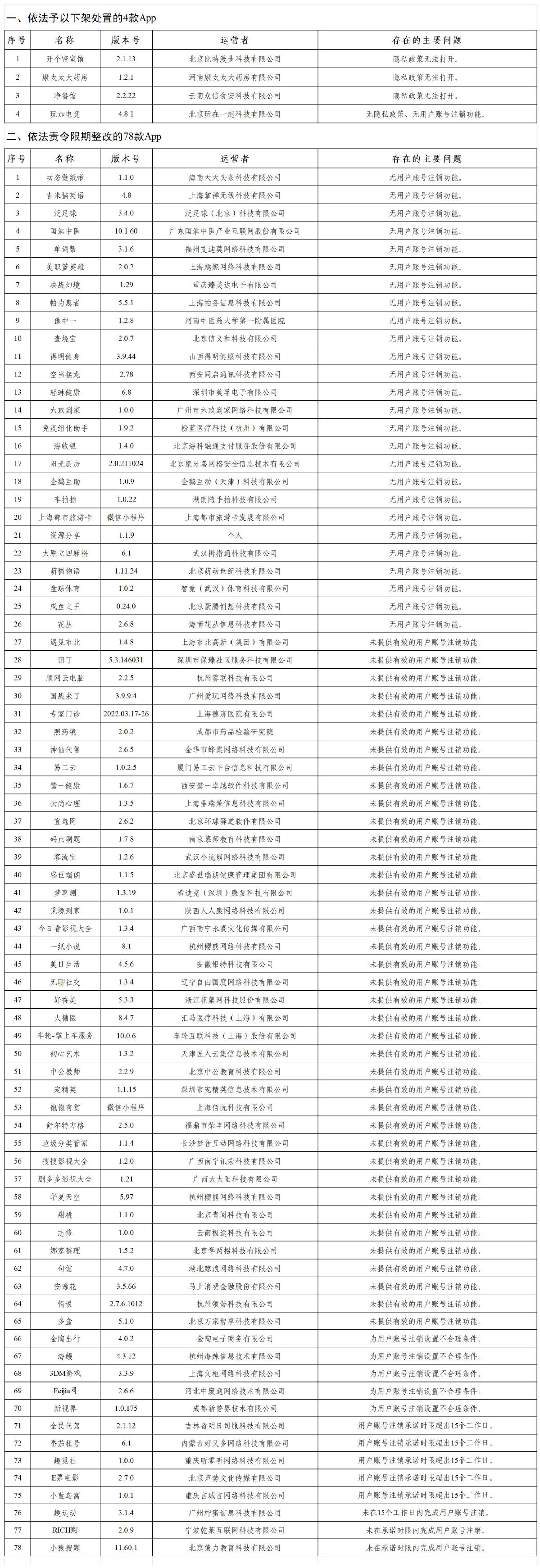 经查,“开个密室馆”等4款App存在未公开收集使用规则问题,违反《个人信息保护法》等法律法规,依法依规予以下架处置;“动态壁纸帝”等78款App存在未按法律规定提供删除或更正个人信息功能问题,违反《个人信息保护法》等法律法规,依法依规责令限期1个月完成整改,逾期未完成整改的,依法依规予以下架处置。