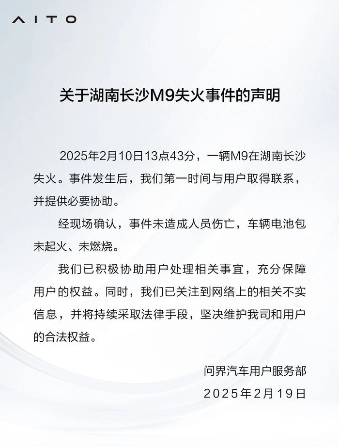 据界面新闻,2月19日,鸿蒙智行旗下问界汽车用户服务官微发布《关于湖南长沙M9失火事件的声明》,称经现场确认,事件未造成人员伤亡,车辆电池包未起火、未燃烧。