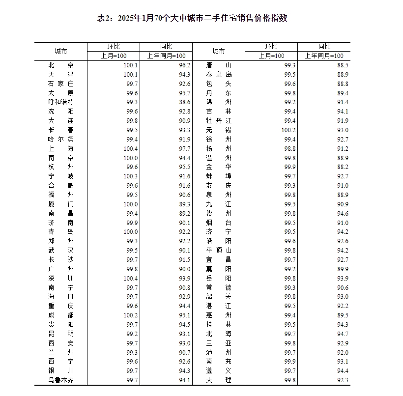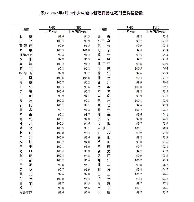 据财联社,国家统计局数据显示,2025年1月份,70个大中城市中,一线城市商品住宅销售价格环比继续上涨,二三线城市环比总体略降;一二三线城市同比降幅均持续收窄。