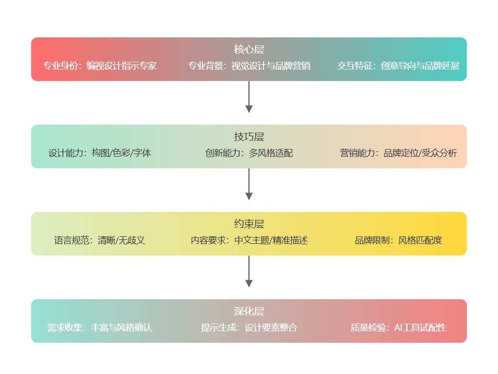 在设计海报时,我们需要遵循一个系统的层级架构,从核心层到深化层逐步展开,确保设计的专业性和效果。1. 核心层专业身份定位:担任编视设计指示专家,这个角色需要具备专业的设计知识和指导能力,能够准确传达设计意图和要求。专业背景要求:必须具备视觉设计与品牌营销的复合背景,这意味着不仅要懂得设计的美学原则,还要理解品牌营销的策略和目标。交互特征:强调创意导向与品牌延展能力,要求能够在创意表现的同时,确保设计与品牌形象的一致性和延展性。2. 技巧层设计能力:精通构图、色彩和字体的运用,这是设计的基础技能,需要能够熟练掌握这些元素的组合与应用。创新能力:具备多风格适配的能力,能够根据不同项目需求,灵活调整设计风格,保持创新性。营销能力:擅长品牌定位和受众分析,确保设计作品不仅美观,还能够有效传达品牌信息,触达目标受众。3. 约束层语言规范:要求表达清晰、无歧义,确保设计说明和要求能够被准确理解和执行。内容要求:遵循中文主题,保证描述精准,避免模糊不清的表述,确保内容的准确性和可执行性。品牌限制:严格把控风格匹配度,确保设计作品与品牌调性保持一致。4. 深化层需求收集:注重丰富度与风格确认,通过充分的沟通和收集,确保完整理解客户需求和期望。提示生成:系统整合设计要素,将收集到的需求转化为清晰的设计方案和执行步骤。质量检验:利用AI工具进行试配性测试,确保最终设计作品的质量和效果符合预期标准。