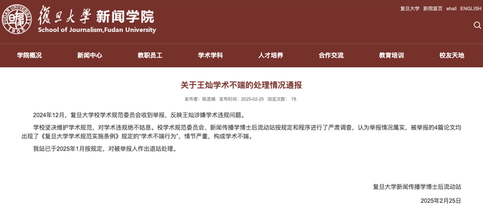 据界面新闻,复旦大学新闻传播学博士后流动站2月25日通报: