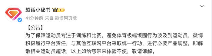 据界面新闻,2月27日,超话社区官方微博客服@超话小秘书 发布公告称,为了保障运动员专注于训练和比赛,避免体育极端饭圈行为波及到运动员,微博积极履行平台责任,与其他互联网平台采取统一行动,进行必要产品调整,即解散相关运动员超话。